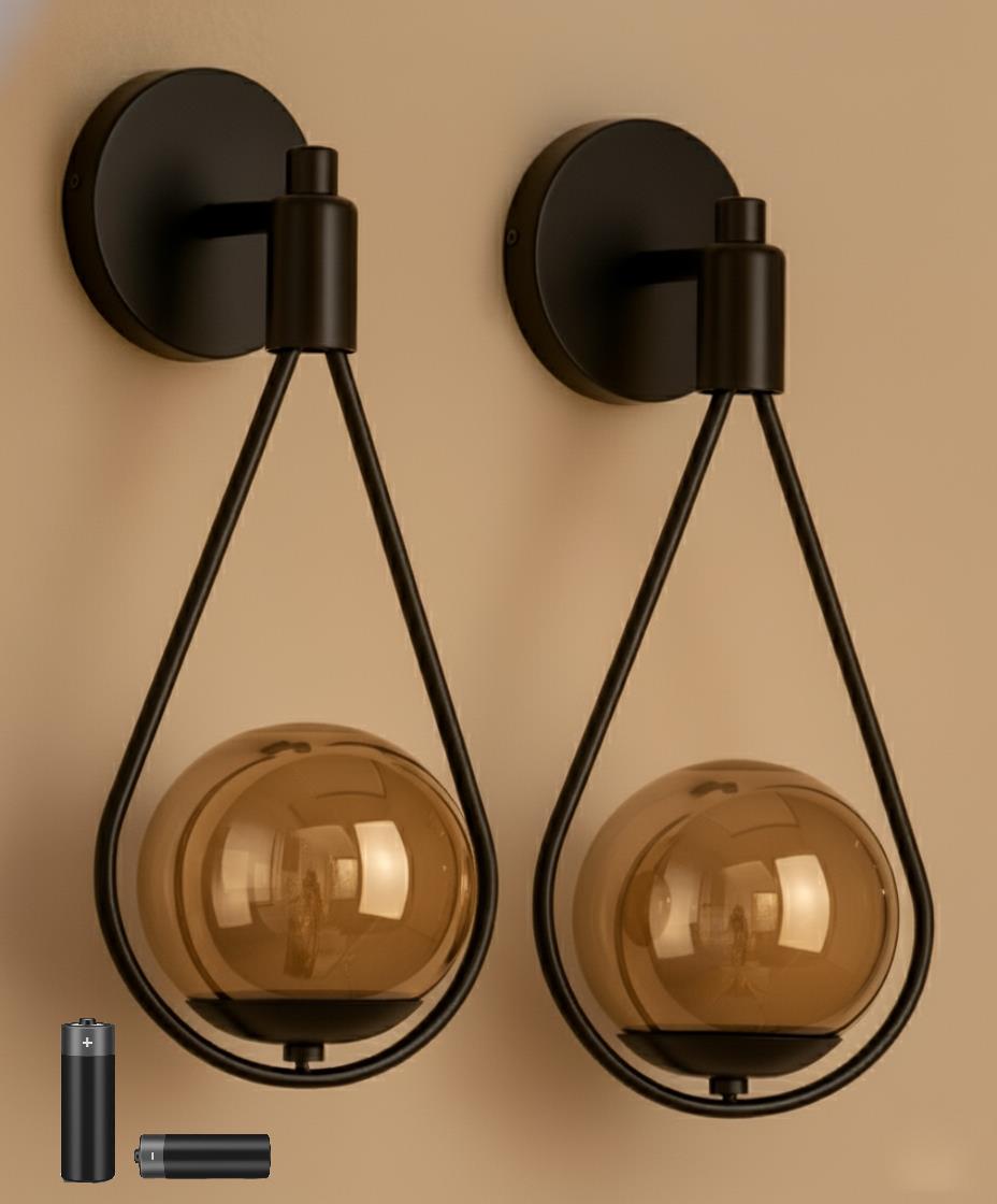 2li Badem Siyah Kasa Bal Glop Camlı Metal Pilli Aplik - Özel Tasarım Lamba ve Pil Dahil