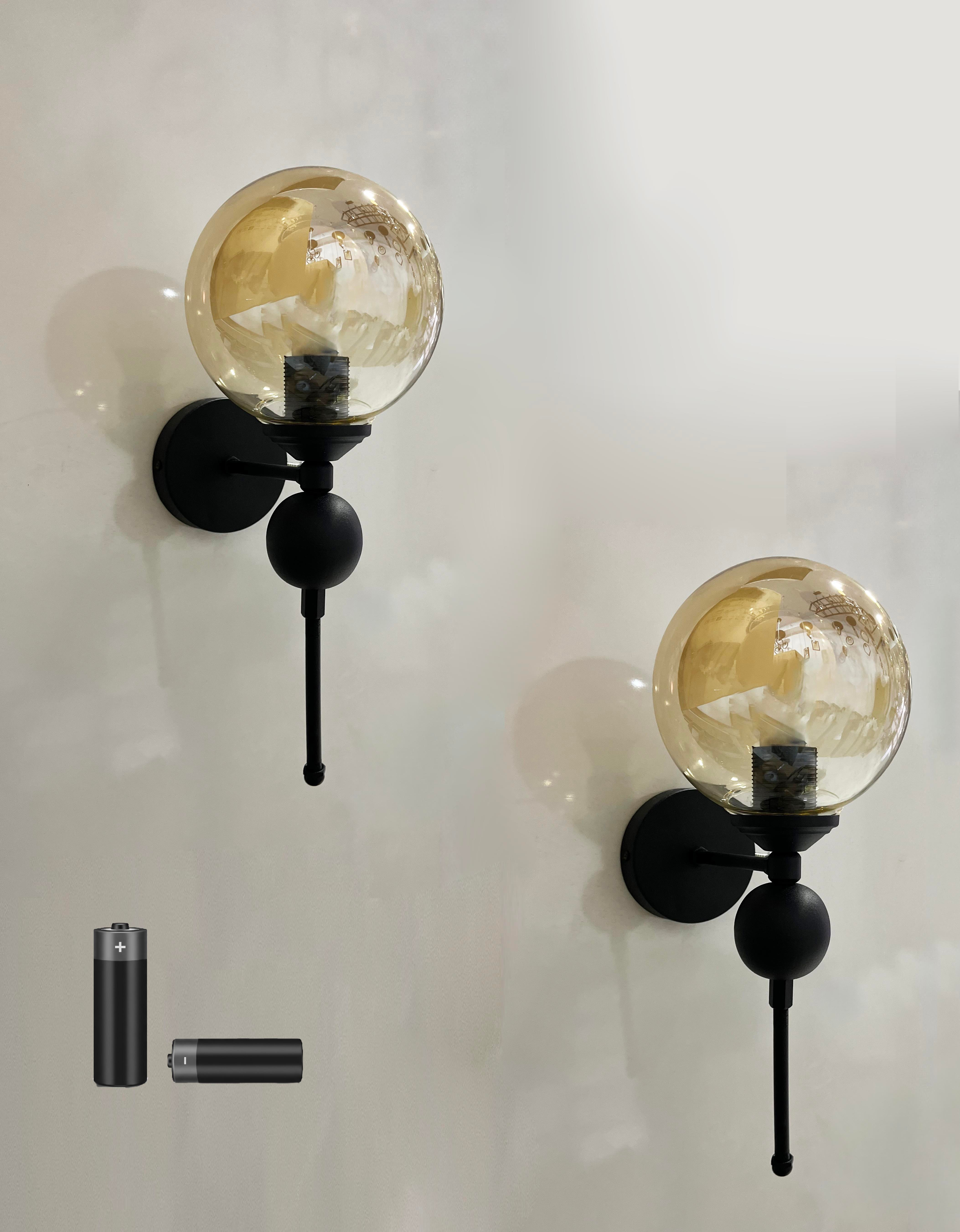 Dora Siyah Kasa Bal Glop Camlı Metal Pilli Aplik - 2 Adet - Özel Tasarım Lamba ve Pil Dahil